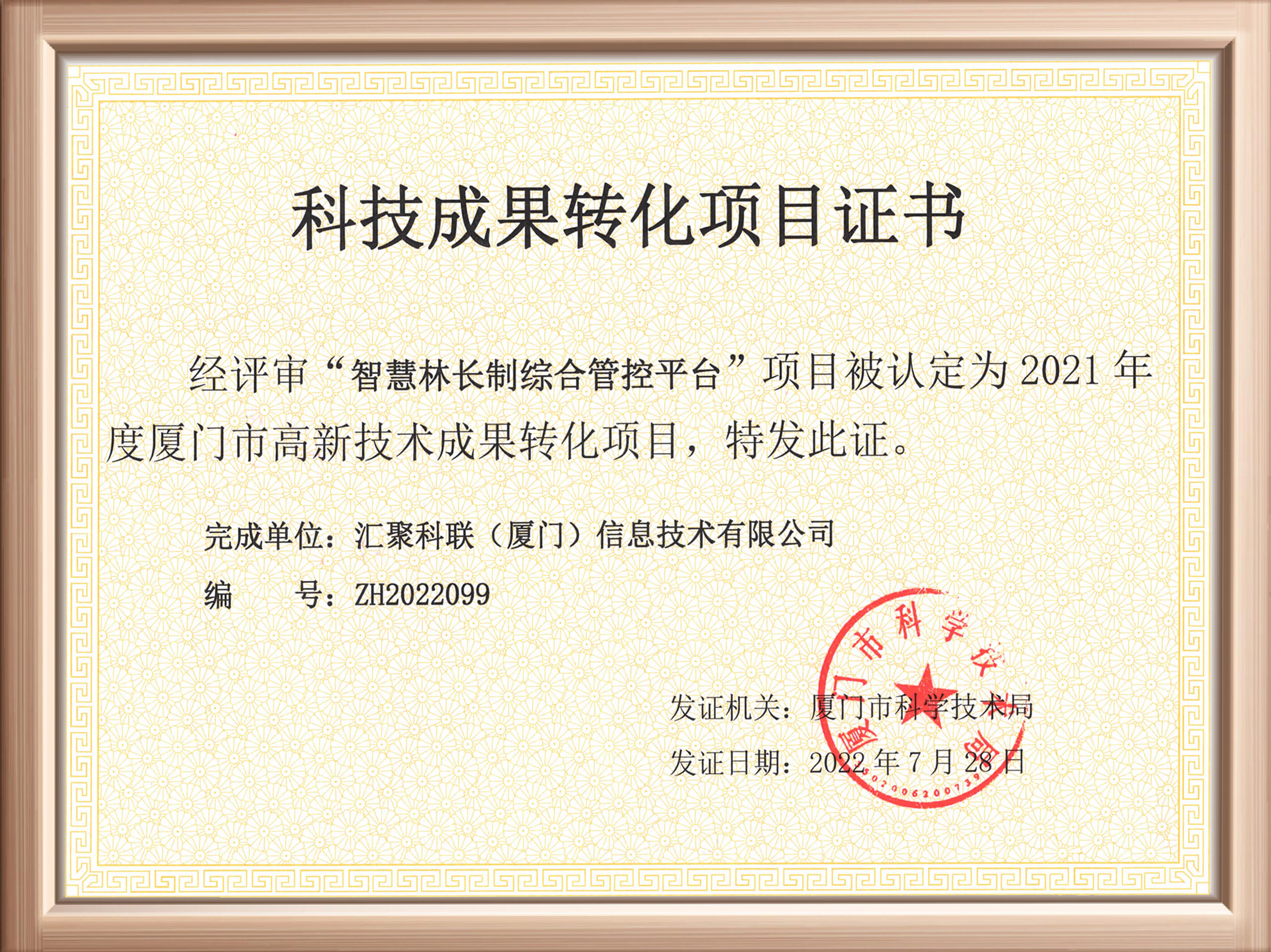 近日,匯聚科聯(lián)收到廈門市科技局頒發(fā)的“科技成果轉(zhuǎn)化項(xiàng)目證書”,公司“智慧林長制綜合管控平臺”經(jīng)過評選,成功被認(rèn)定為2021年度廈門市高新技術(shù)成果轉(zhuǎn)化項(xiàng)目。